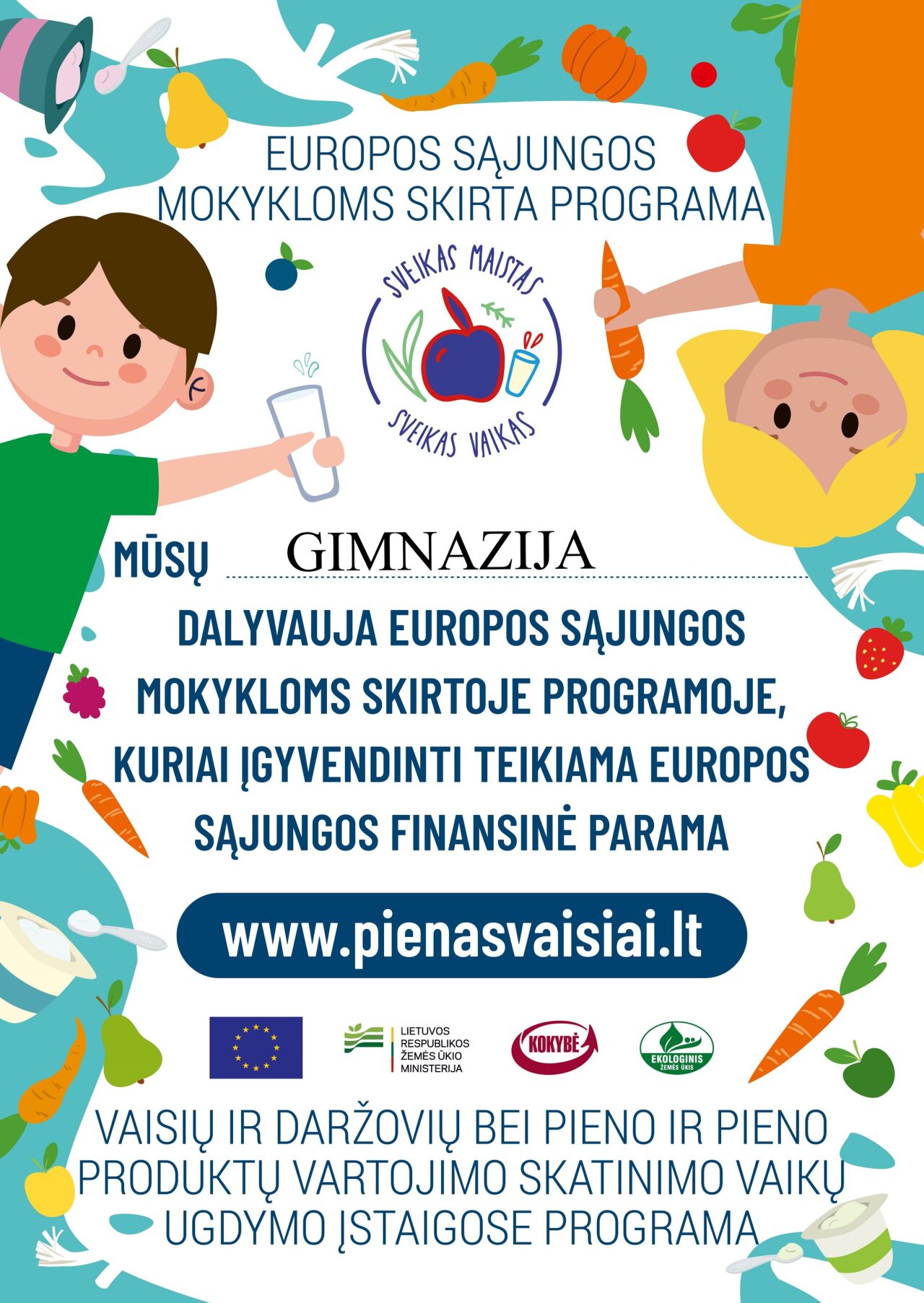 Mokykla dalyvauja Vaisių ir daržovių bei pieno ir pieno produktų vartojimo skatinimo vaikų ugdymo įstaigose programoje: